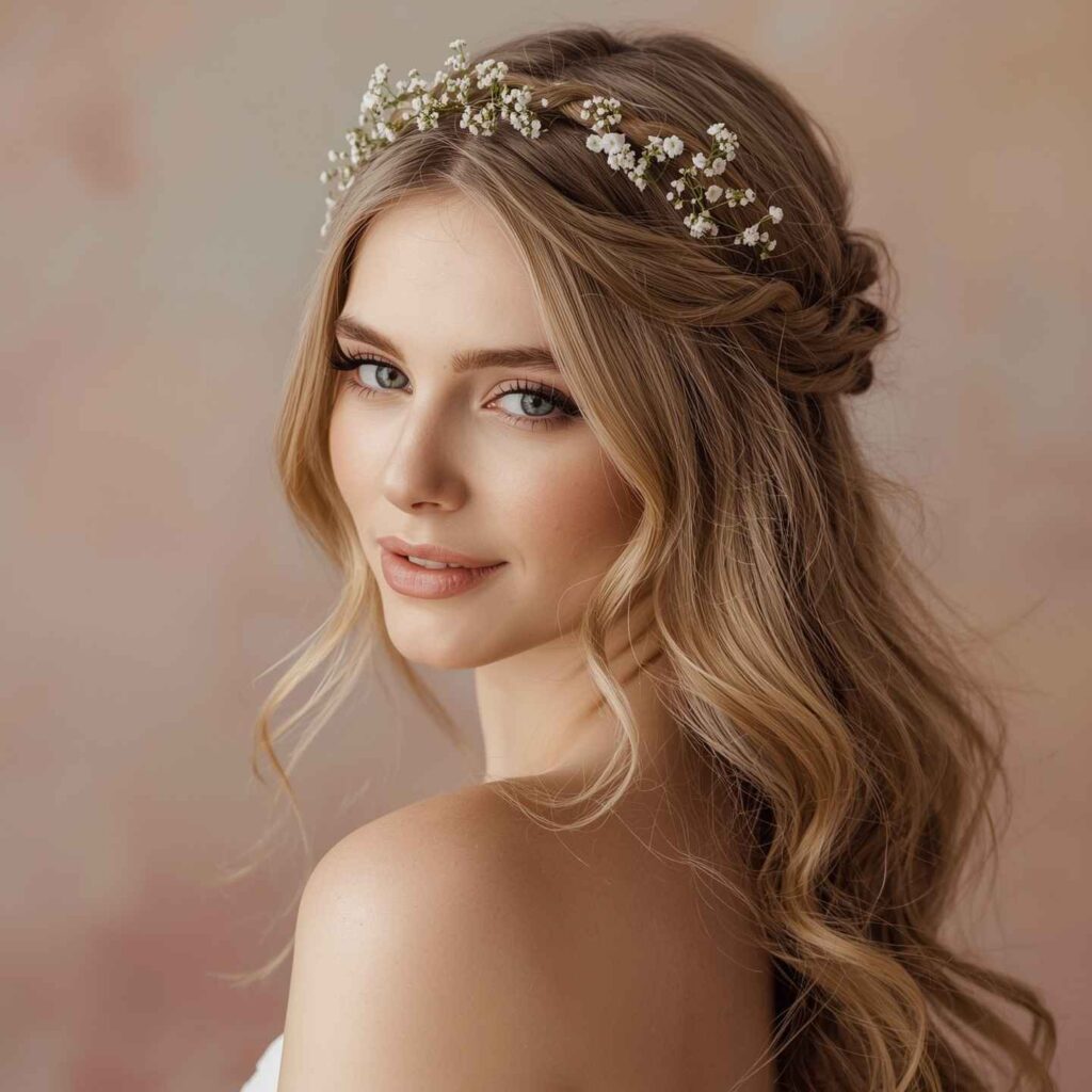 If you want a hairstyle that feels romantic and whimsical, the braided crown is your best bet. In this style, you braid small sections of hair from both sides and pin them across the back of your head, forming a crown-like effect. The rest of the hair stays down, creating a soft, feminine appearance. This half-up, down hairstyle is ideal for weddings, garden parties, or any event where you want to look a little extra without going overboard.