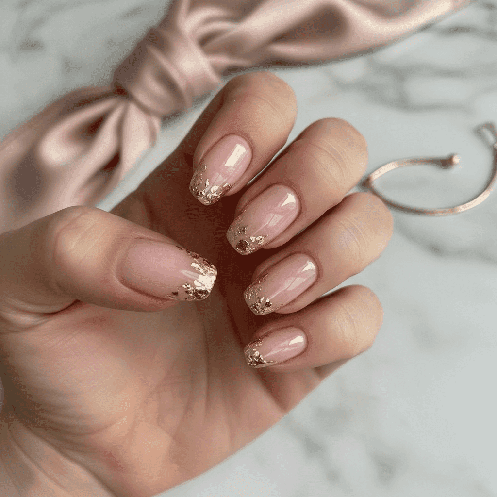 For anyone who enjoys a touch of sparkle, gold foil is a perfect choice. Instead of coating every nail, apply thin fragments of foil on a neutral base. The contrast between soft beige polish and shiny metallic accents creates a luxurious finish without going overboard.
