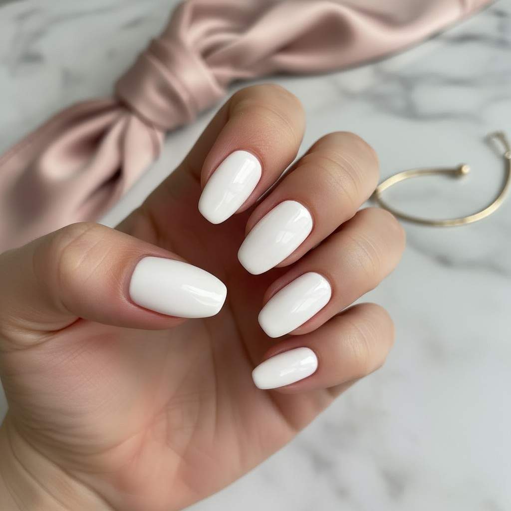 - A pearly glaze adds a gentle glow, giving short nails a refined and luminous appearance.